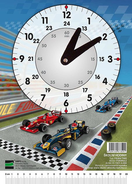 Školní hodiny slouží k výuce času prvňáčkům základních škol. Ve spodní části hodin je pravítko, které se může odstřihnout a používat samostatně.