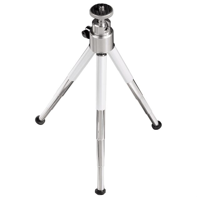 - For non-jerky images and a steady hold on uneven surfaces - The 3D ball head allows perfect alignment for shots in portrait and landscape format - For photo and video cameras, microphones and mini speakers Technical Details: - Thread/Connection: 1/4" (6.4 mm) - Handle: None - Leg Segments: 4 Sections (3x Extendible) - Levelling Device: No - Material: Metal - Tripod Head: 3D Ball Tilt Head - Maximum Height: 19 cm - Minimum Height: 10,5 cm - Weight: 110 g - Colour: Silver/White - Line: Ball - Use: Photo/Video (3D) Scope Of Delivery: - 1 "Ball" mini tripod