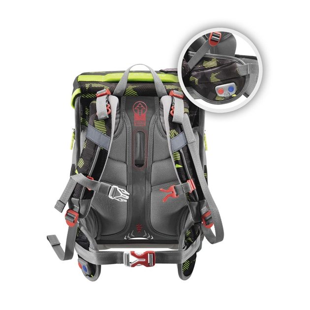- možnost plynulého výškového nastavení ramenních popruhů pomocí otočného mechanismu uvnitř aktovky, zajišťuje přesné nastavení ramenních popruhů přímo na zádech dítěte