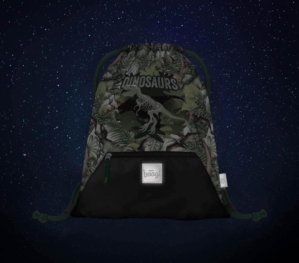 Sáček na cvičky nebo přezůvky s motivem Dinosaurus, v dolní části praktická kapsa na zip.
