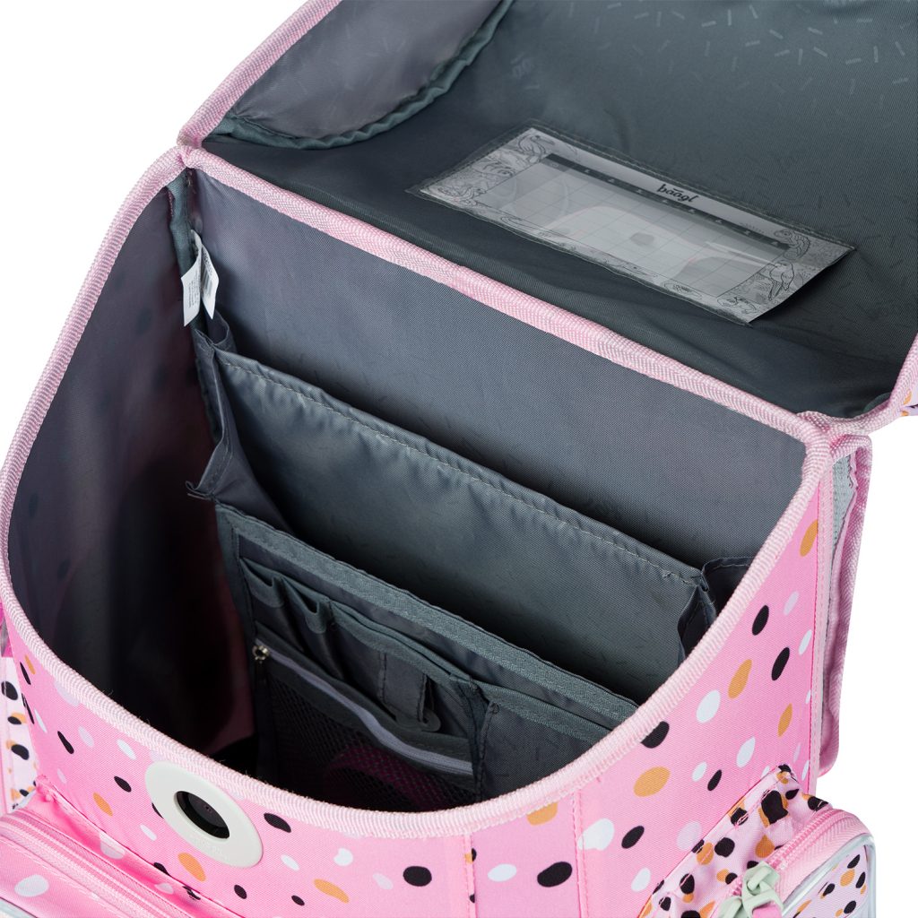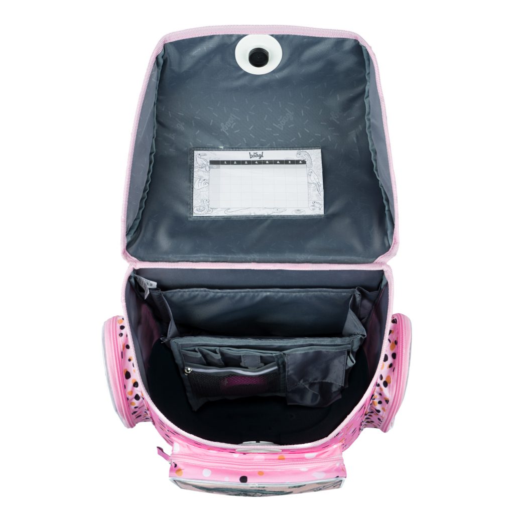• Uvnitř aktovky je průhledná kapsa s rozvrhem a vnitřní organizér umožňující rovnoměrné rozložení hmotnosti.