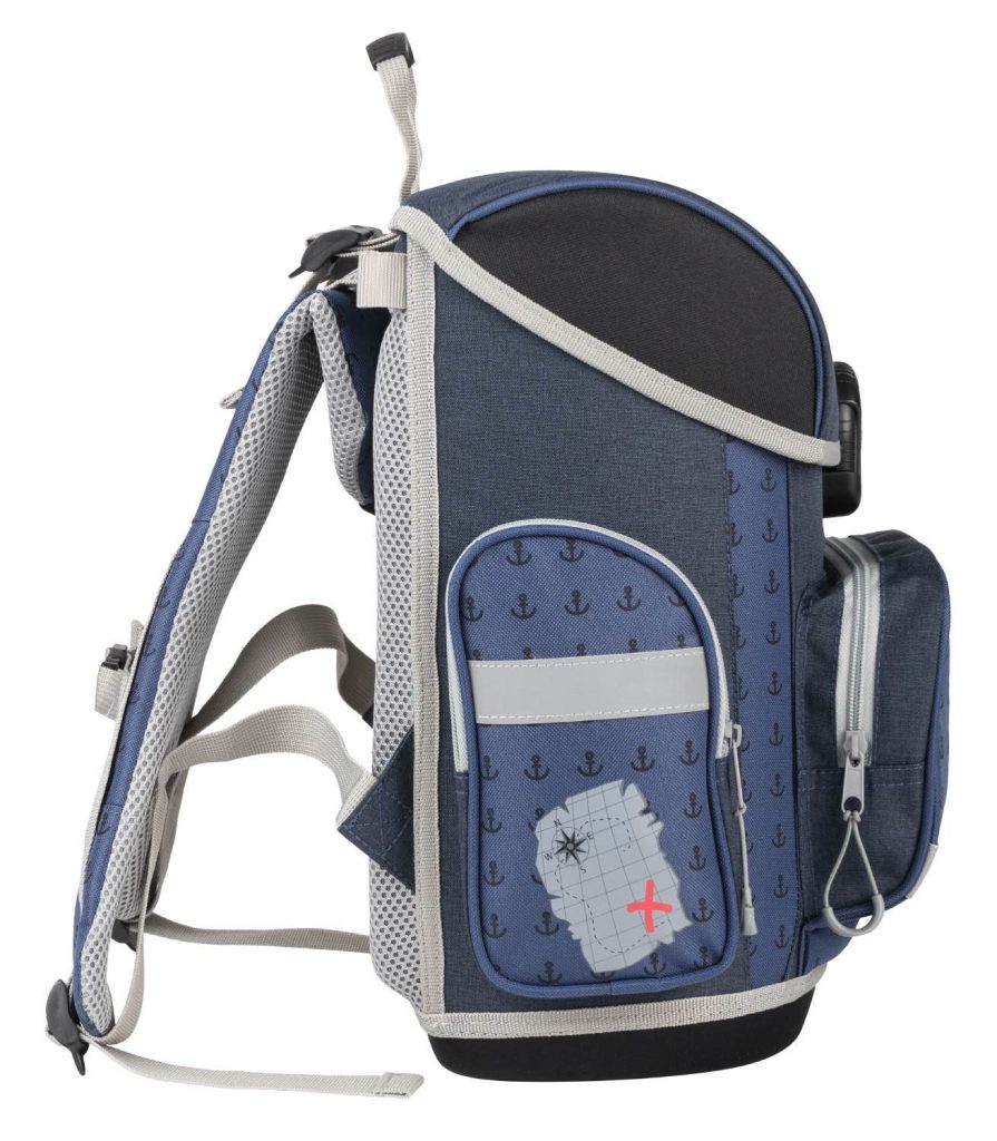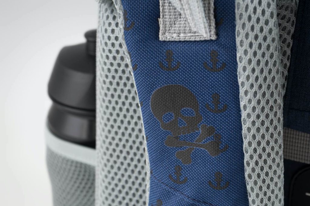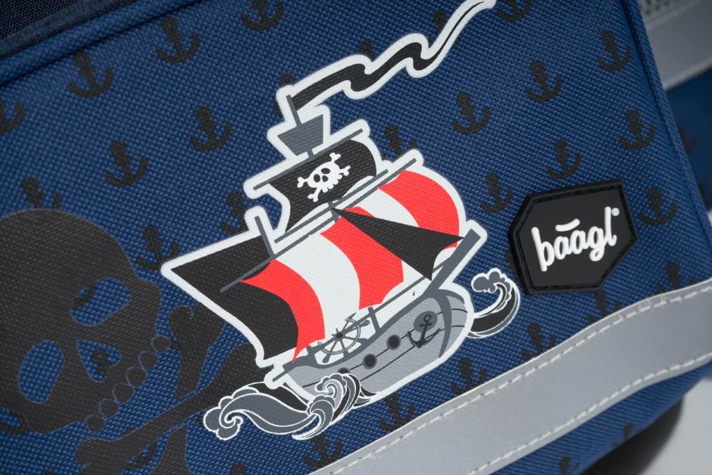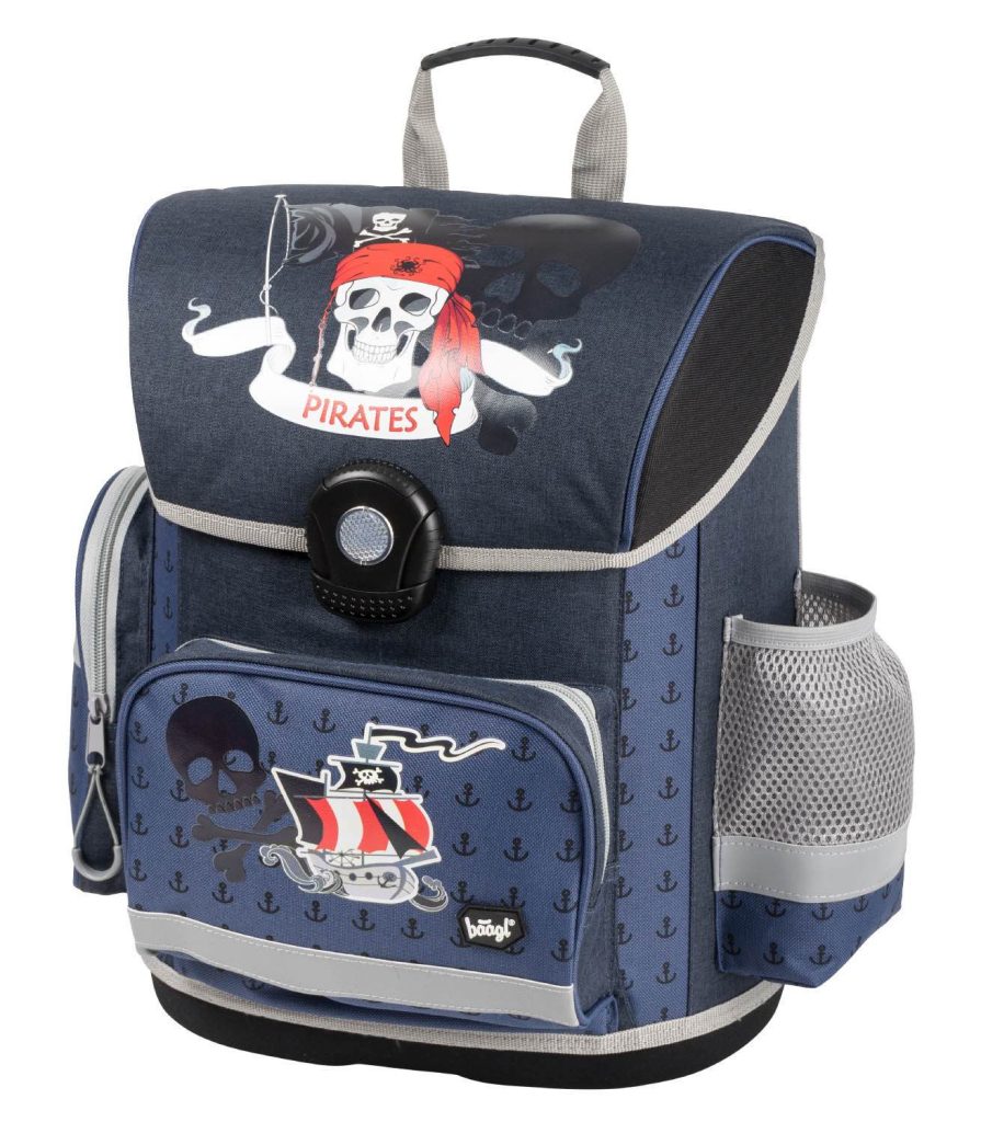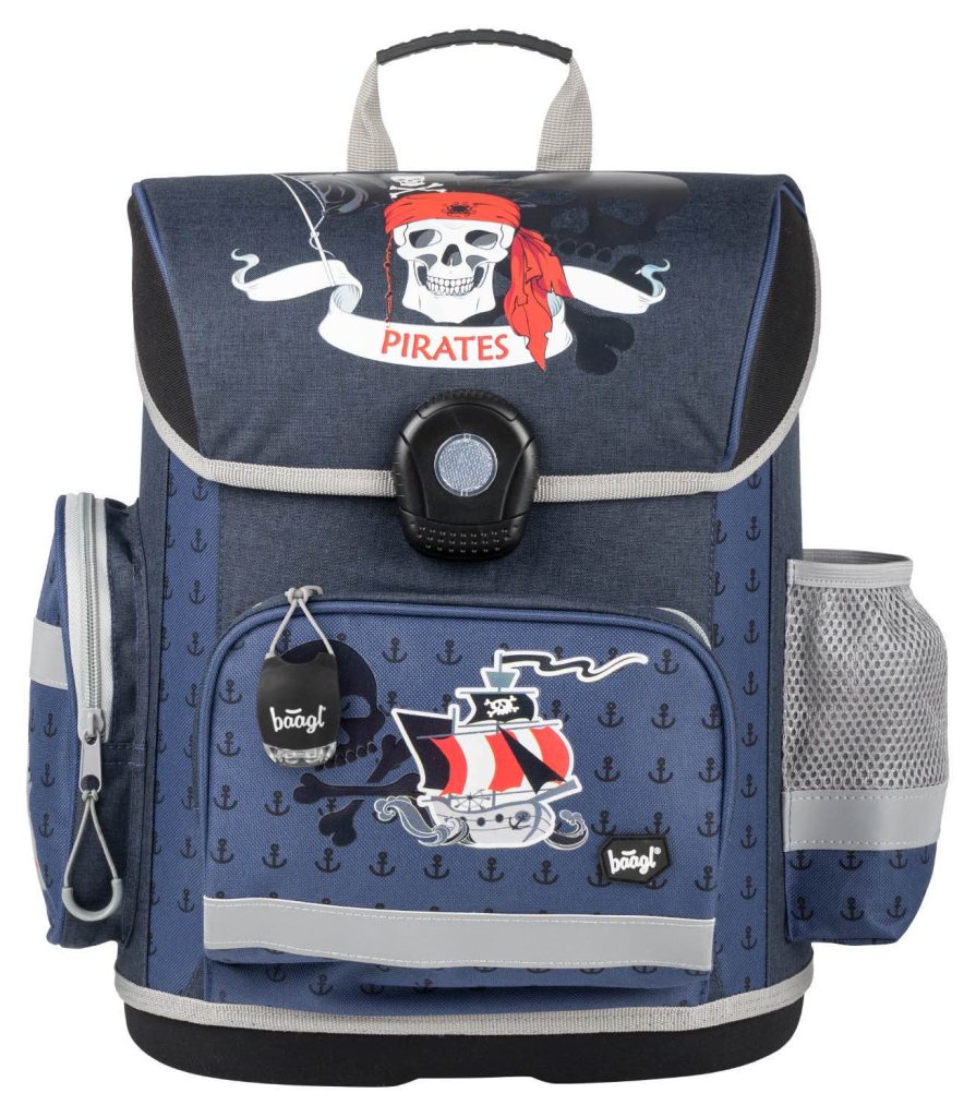 Školní aktovka s motivem pirátů na přední části, vhodná pro žáky 1.–2. třídy ZŠ. Aktovka byla úspěšně testována v ITC Zlín. • Školní aktovka s vyztuženým tělem, vnitřním organizérem a třemi oddělenými kapsami a zapínáním na kvalitní přezku.