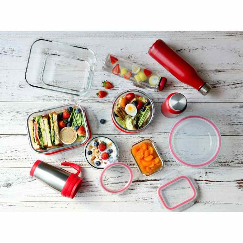 BERGNER Dóza na potraviny skleněná se zaklapovacím víkem 1,5l BG-25026-RD - přenosná dóza na potraviny, oběd i svačinu- vyrobená z odolného borosilikátového skla- výhodou skla je rozhodně jeho 100% zdravotní nezávadnost- v dóze můžete jídlo rovnou ohřát v mikrovlnné troubě, případně i krátce zapéct v klasické troubě- borosilikátové sklo je silnostěnné a dobře odolává nárazům a poškození- spolehlivé zaklapovací víčko na 4 boční klipsy- silikonové těsnění ve víku zabrání protékání a vylití obsahu- vhodné do lednice, mikrovlnné trouby, myčky nádobí- v misce lze také zapékat v klasické troubě a to do teploty max 180°C- celkový objem: 1,5 litru- značka: Bergner