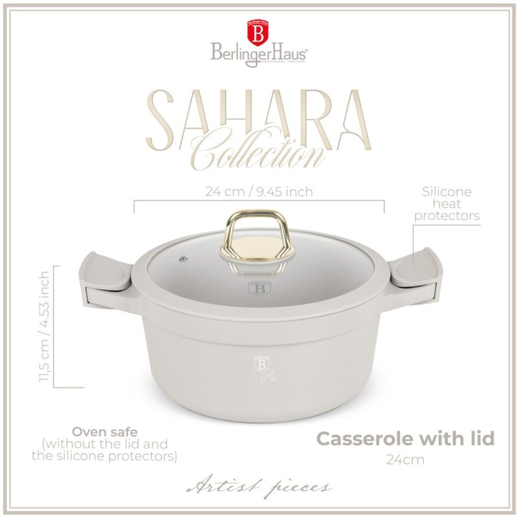 Elegantní kastrol z kolekce Sahara Collection s titanovým povrchem je ideálním pomocníkem pro každodenní vaření. S objemem 4,4 l a průměrem 24 cm je vhodný pro přípravu různých pokrmů. Skleněná poklice se silikonovým okrajem zajišťuje bezpečné vaření, zatímco odnímatelné silikonové rukojeti umožňují snadnou manipulaci. Kastrol je kompatibilní s indukčními, sklokeramickými, plynovými i elektrickými varnými deskami a je vhodný také pro použití v troubě.