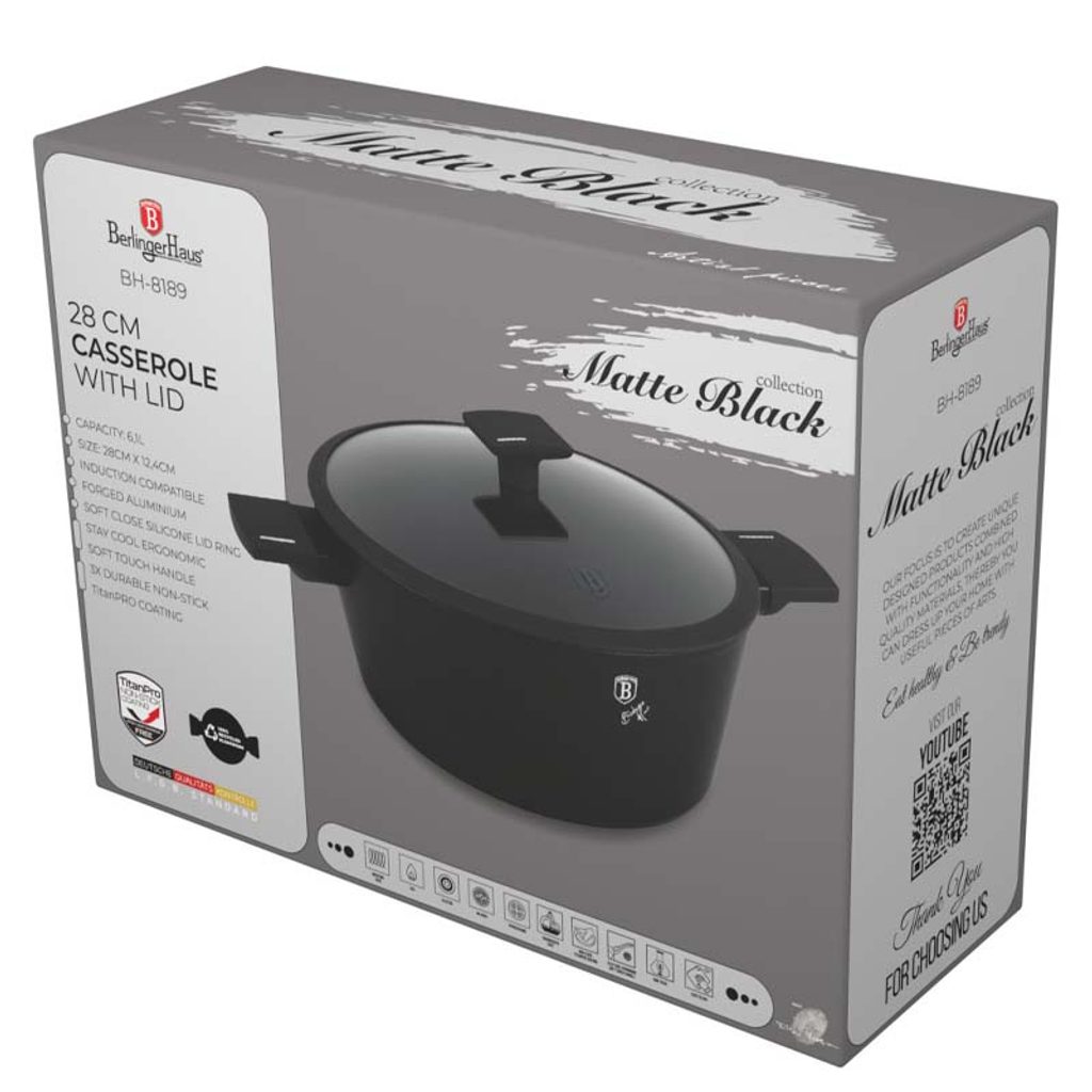 Tento hrnec je vyroben z kovaného hliníku s nepřilnavým povrchem TitanPro, který zajišťuje vysokou kvalitu a odolnost. Hrnec má rozměry 28x12,4 cm a objem 6,1 litru. Matná černá barva a minimalistický styl dodávají hrnci moderní vzhled. Ergonomická rukojeť a knoflík s měkkým dotykem Stay Cool zajišťují pohodlné a bezpečné používání. Cedící poklice je vyrobena z tvrzeného skla s tepelně odolným silikonovým systémem Soft Close.