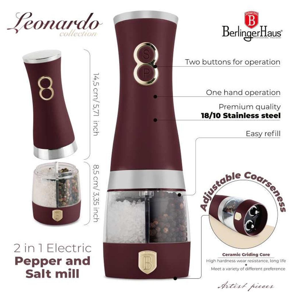 Tento elektrický mlýnek 2 v 1 v matné bordó barvě kombinuje elegantní design a maximální praktičnost. Umožňuje mletí pepře i soli v jednom těle pomocí samostatných tlačítek, takže ušetří místo a přináší pohodlí při každodenním vaření. Je vybaven nastavitelnými keramickými čepelemi pro individuální volbu hrubosti mletí a snadným ovládáním jednou rukou.