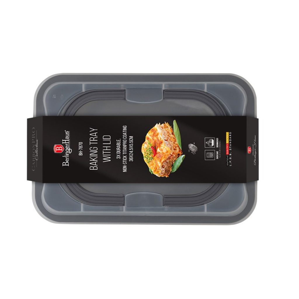 Užijte si pohodlí pečení a servírování kdekoliv díky tomuto praktickému plechu s titanovým nepřilnavým povlakem a přenosným plastovým víkem. Vyroben z pevné uhlíkové oceli s elegantním metalickým tmavě šedým designem, který bude ozdobou každé kuchyně i piknikového stolu. Díky své velikosti 36,5 × 24,5 × 5,5 cm se snadno vejde do trouby až do 220 °C a zároveň umožní bezpečný přenos vašich pokrmů. Nepřilnavý titanový povlak usnadní čištění a ekologické provedení bez PFOA, olova a kadmia zajistí zdravé vaření.