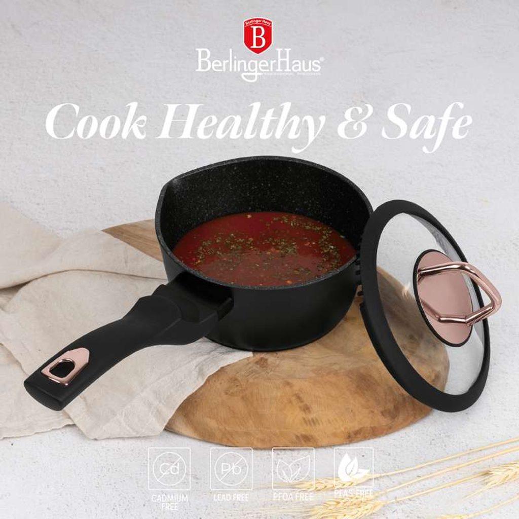 - Šetrné: Sada nádobí Black Rose Collection neobsahuje PFOA, olovo ani kadmium, což z ní činí ekologickou a zdravou volbu pro vaši kuchyni.