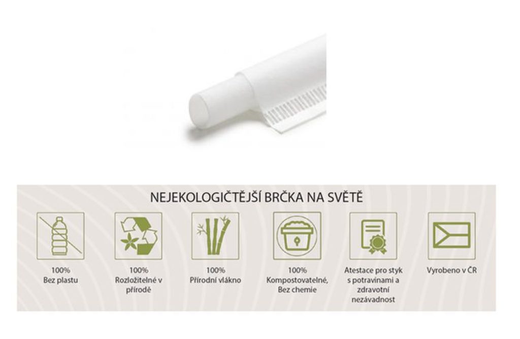Brčka jsou vyrobena ze 100% přírodních vláken bez chemických a plastových hmot, zcela kompostovatelných a za přírodních podmínek biologicky rozložitelných. Vyrobeno v ČR.