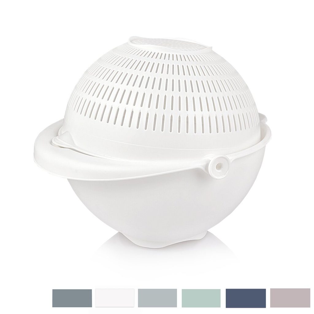 Miska s otočným cedníkem. Naprosto skvělý pomocník při omývání zeleniny, ovoce, cezení těstovin… Při naklánění misky zůstává cedník ve vodorovné poloze – tedy vodu velmi pohodlně slijete, ale obsah cedníku nemusíte hlídat, nikam se nevysype. Nabízí velmi pohodlnou a snadnou přípravu salátů a jiných pokrmů. Materiál: plast. Rozměry: pr. 25 cm, v. 12 cm. Assort barev.