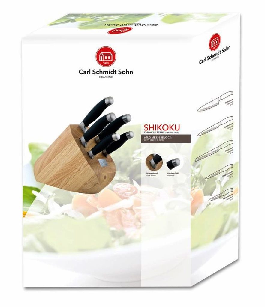 Sada nožů v bloku 6 ks SHIKOKU NEW je výbornou alternativou pro kuchaře různých úrovní, na jejíž výrobu byl použit kvalitní materiál: nerez ocel s nepřilnavým povrchem, vynikají perfektní ostrostí čepele a designem. Velmi oceníte i ergonomicky tvarovanou rukojeť, díky které se vám nože budou skvěle držet. Celá sada je dílem výrobce CS SOLINGEN, jež se výrobě nožů věnuje poměrně dlouho a jsou řádně odzkoušeny.