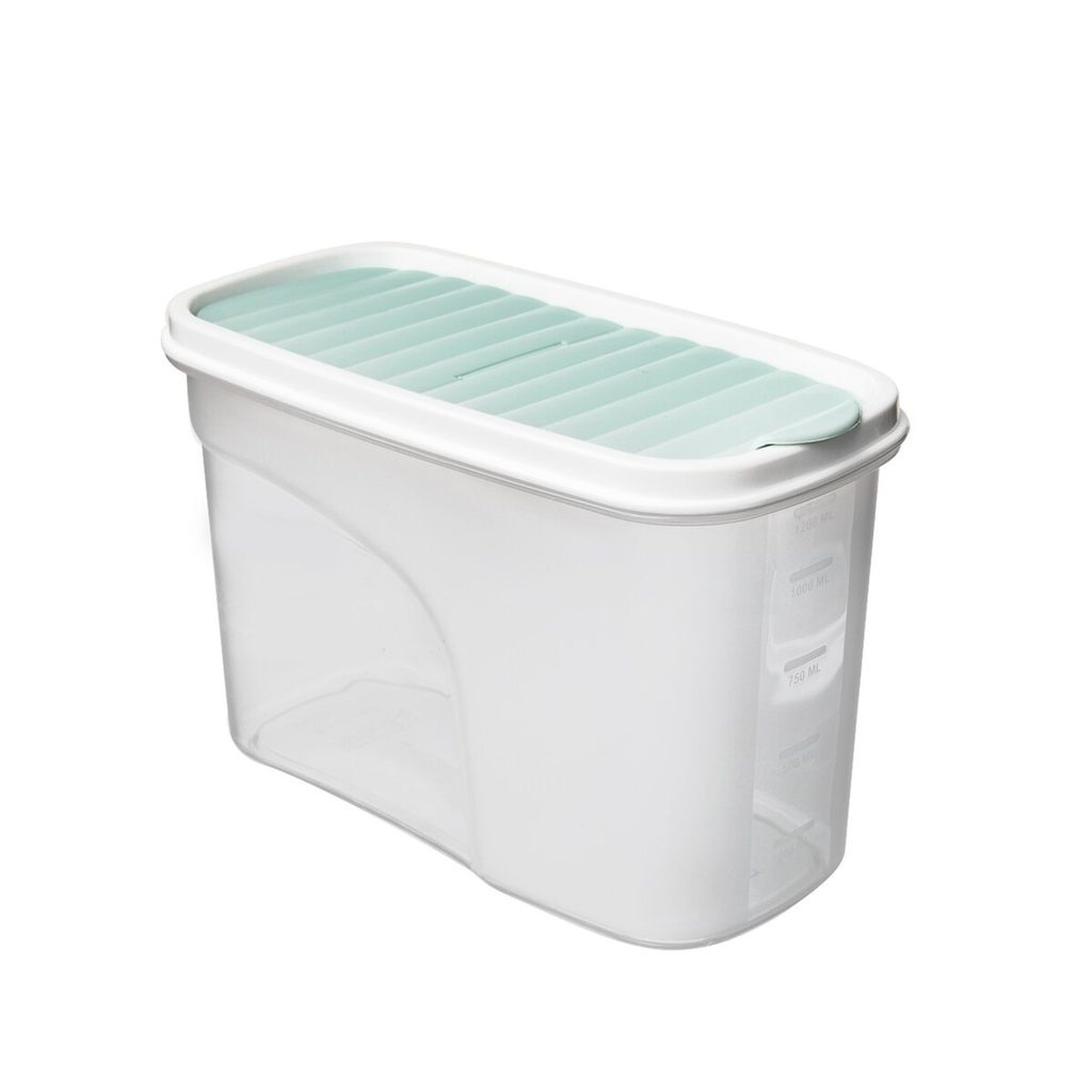 Dóza s dávkovacím uzávěrem je vhodná pro uložení mouky, luštěnin, cereálií... Vyznačená odměrka po 250 ml. Materiál: plast. Použití od – 25 °C do 95 °C. Vhodná do MVT, ale bez víčka nebo s otevřeným průchodem ve víčku. Rozměry: objem 1,2 l, 9,5x19x12 cm.