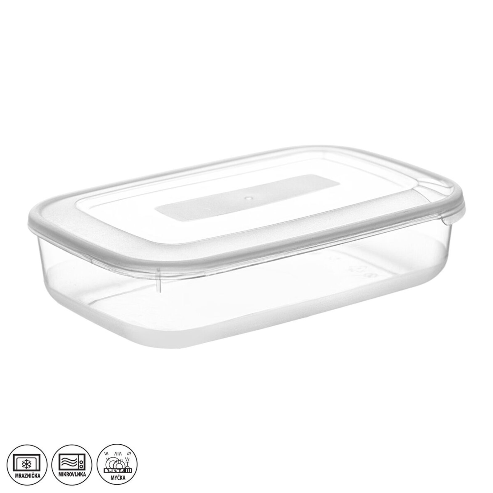 Dóza s víčkem je vhodná pro uložení potravin v chladničce, ohřev v MVT. Materiál: plast. Rozměry: 20x13x5 cm.