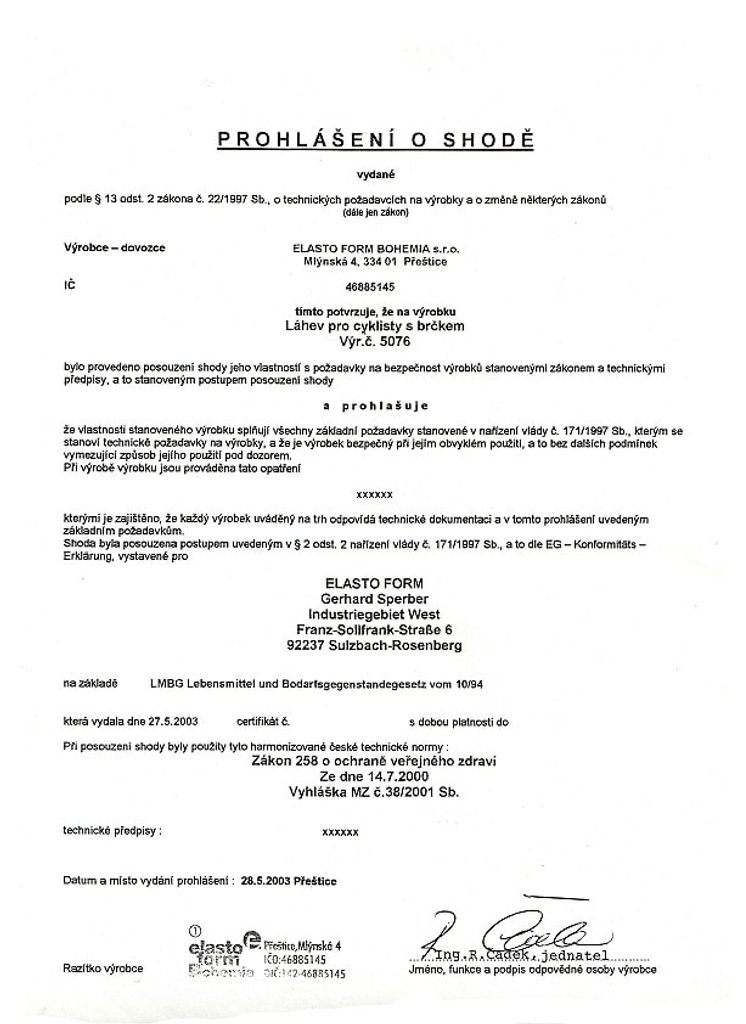 • Výrobce dodržuje zákonné normy, platí daně a odvody na sociálním a zdravotním pojištění na území ČR.