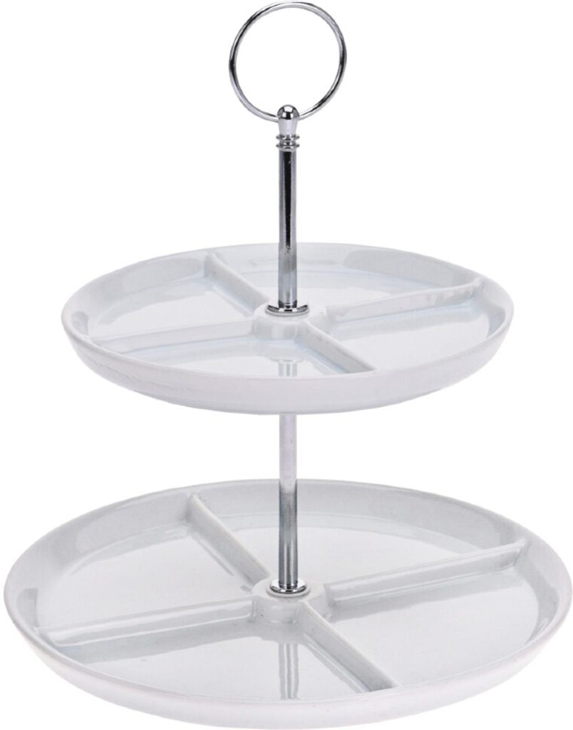 EXCELLENT HOUSEWARE Etažér dvoupatrový porcelánový KO-795880410 - dvoupatrový etažér na potraviny- často využívaný jako stojan na vánoční cukroví- vhodný nejen na cukroví, dortíky, zákusky, muffiny, makronky, ale i ovoce nebo slané chuťovky- podnosy z lesklého bílého porcelánu- chromovaná konstrukční tyč ve stříbrné barvě- snadné přenášení díky hornímu madlu- rozměry spodního podnosu: 21 cm- rozměry horního podnosu: 16 cm- výška: 24 cm- barva: bílá lesklá / chrom- značka: Excellent Houseware