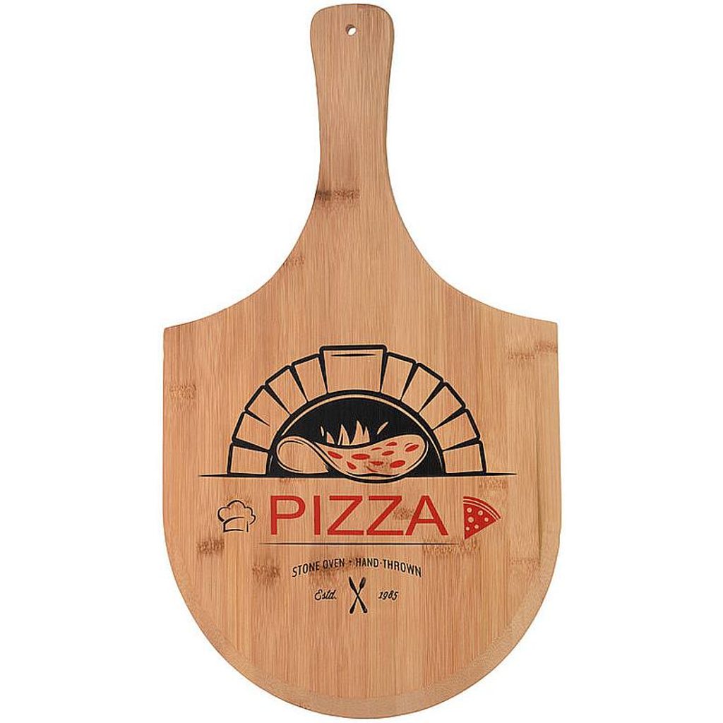 Prkénko na pizzu z kvalitního bambusu (Bambusa Albostriata) je ideální pro přípravu a servírování domácí pizzy. Díky svému praktickému otvoru pro zavěšení se snadno skladujte a přidává rustikální šarm každému stolu. Nápis Pizza, obrázek pece.
