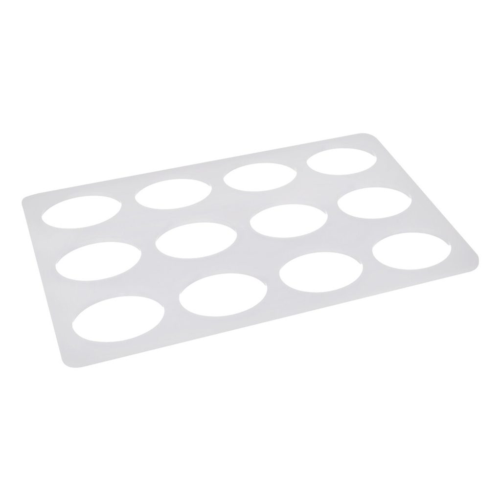 Forma na sněhové laskonky. Jednoduše položíte šablonu na pečicí papír na plech, rozetřete stěrkou po šabloně sněhovou hmotu a formu odklopíte. Materiál: plast. 12 ks laskonek. Rozměry: forma 18x30x0,5 cm, jedna laskonka 6x4 cm.