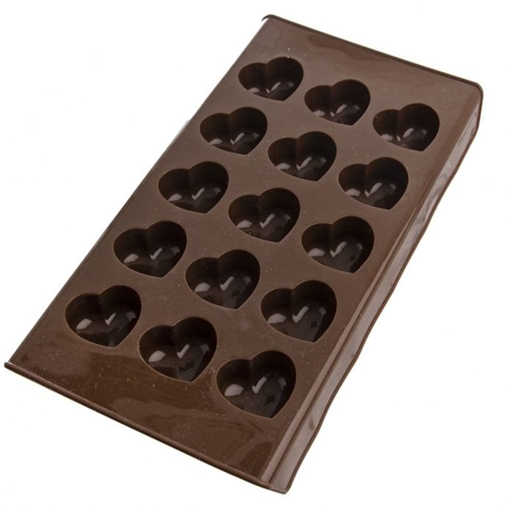 Nepřilnavá hnědá silikonová forma pro rychlé pečení 15 ks malých sušenek nebo k výrobě originálních čokoládových pralinek ve tvaru srdce. Je vhodná do myčky.