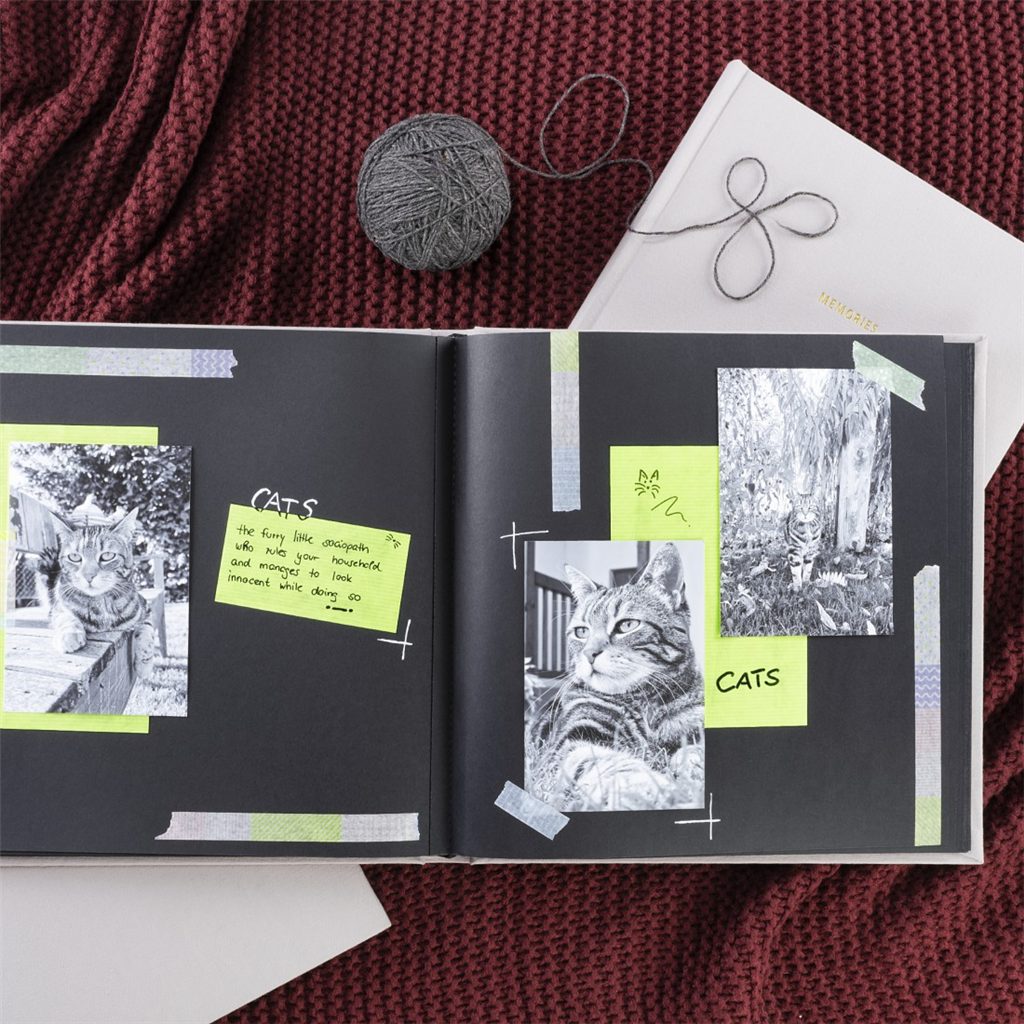 - černé vnitřní listy poskytují prostor pro vaše příběhy a vzpomínky (fotografie, kresby, texty, pohlednice, vstupenky …)
