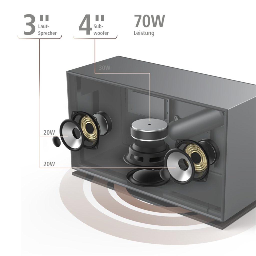 - širokopásmové reproduktory (2x 20 W) se subwooferem (30 W), celkem 70 W RMS