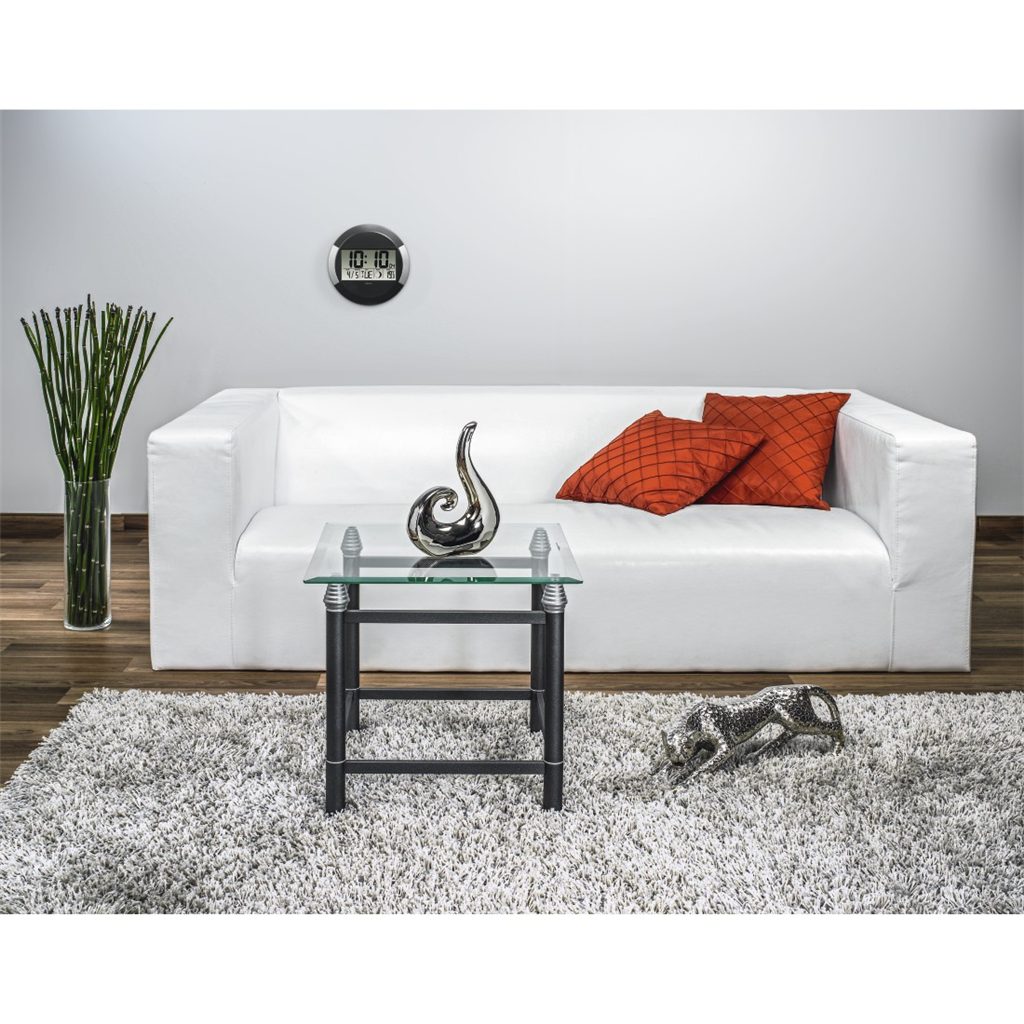 - možnost postavení na rovnou plochu (stůl, police apod.) dík vyklápěcí nožce, nebo zavěšení na zeď pomocí otvoru na zadní straně