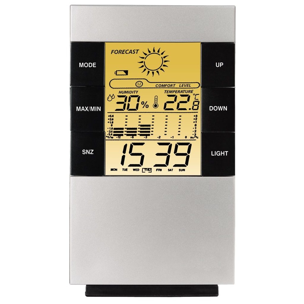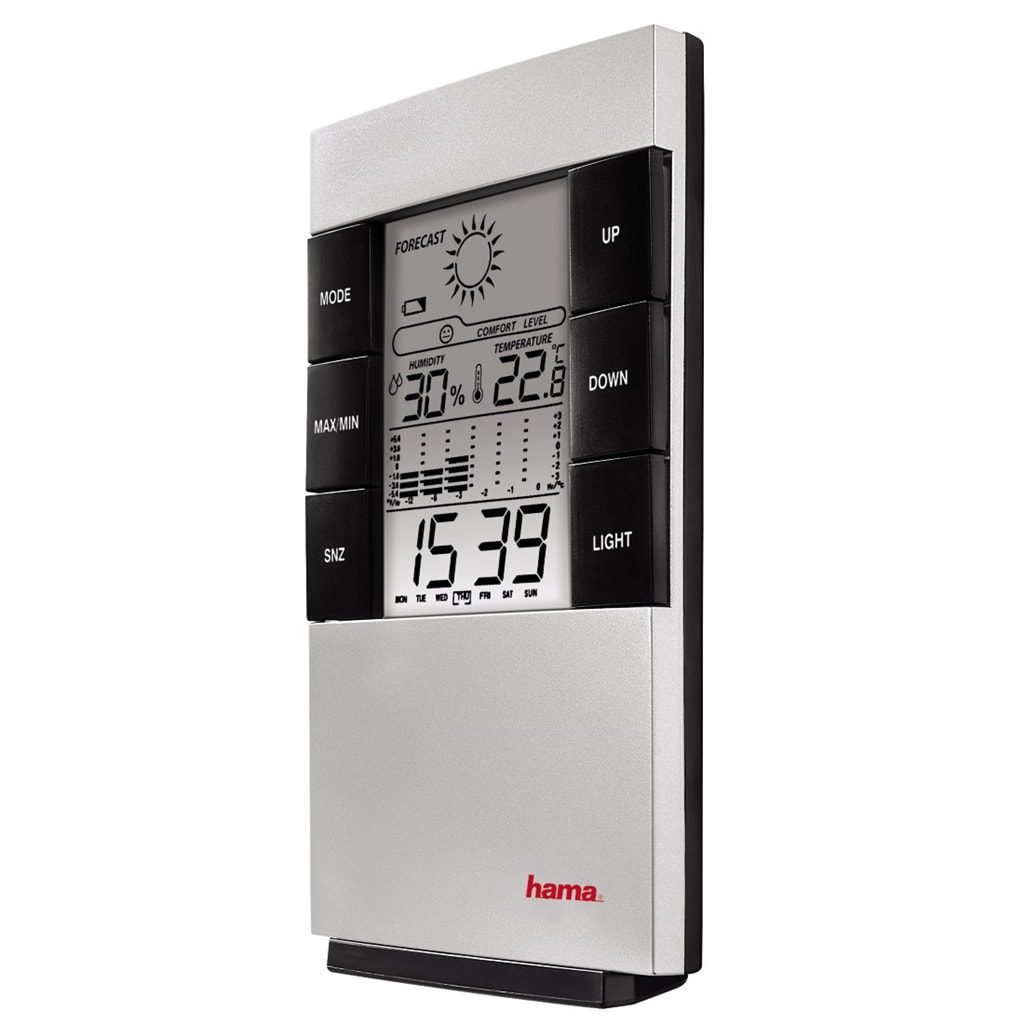- pre digitálne zobrazenie teploty, vlhkosti vzduchu, času, dňa v týždni, dátumu, teplotného profilu a predpovede počasia - napájanie: 2x AAA/Micro (nie sú súčasťou dodávky) - farba: antracitová/strieborná Teplomer: - teplotný rozsah: 0°C až 50°C (32°F až 122°F) - zobrazenie v °C, alebo °F - uloženie min./max. nameraných hodnôt teploty Vlhkomer: - rozsah: 20% - 99% - uloženie min./max. nameraných hodnôt vlhkosti vzduchu Barometer: - predpoveď počasia (slnečno, polooblačno, oblačno, dážď)* Hodiny/kalendár: - zobrazenie času v 12-/24-hodinovom formáte - zobrazenie dátumu a dňa v týždni - budík Ďalšie funkcie: - teplotný profil v stĺpcovom grafe * Informácia pre užívateľa: Pri tomto výrobku je pre predpoveď počasia použitá teplota a vlhkosť vzduchu. Predpoveď počasia je vyrátaná softvérom na základe naprogramovania. Tento výrobok nie je meteostanica. Pre presnejšiu predpoveď počasia si zaobstarajte meteostanicu, ktorá berie do úvahy aj namerané hodnoty tlaku vzduchu za určité časové obdobie.