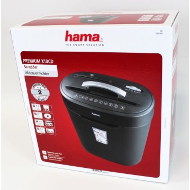 - skartovačka s krížovým rezom - skartovanie až 10 hárkov papiera DIN A4 naraz - vhodná aj na skartovanie CD/DVD/Blu-ray diskov a plastových kariet - skartovanie plastových kariet cez separátny slot alebo cez otvor na skartovanie papiera - skartovanie CD/DVD/Blu-ray diskov cez separátny slot - vysokokvalitné nože vyrobené z ocele si poradia aj so spinkami - papier je zoskartovaný na malé kúsky, čo maximalizuje kapacitu koša na zoskartované kúsky - automatický štart a stop vďaka infračervenému senzoru - automatické vypnutie po odňatí skartovacej hlavice (kontaktný spínač) Informácia pre spotrebiteľov: Norma DIN 66399: Každá osoba, či už právnická alebo súkromná, je zodpovedná za ohľaduplné a bezpečné zničenie všetkých dôverných, osobných a citlivých údajov. Či už sa jedná o externé alebo vaše vlastné údaje, ktoré vyžadujú špeciálnu ochranu, odporúčame, aby ste dbali na to, aby sa tieto údaje nedostali do nesprávnych rúk. Skartovačky Hama vám v tomto spoľahlivo pomôžu. Táto skartovačka zabezpečí ochranu údajov v malých kanceláriách. Technické údaje: - napájanie: 220 - 240 V ~ - kapacita (papier, CD/DVD/Blu-ray disky/plastové karty): 16 l - max. rýchlosť skartovania: 2,2 m/min. - max. šírka otvoru (CD/DVD/Blu-ray disky): 125 mm - max. šírka otvoru (papier): 225 mm - max. šírka otvoru (plastové karty): 225 mm - max. úroveň hluku: 70 dB - max. nepretržitá prevádzka: 2 minúty - max. výkon skartovania - hárky papiera (70 g/m2): 10 - max. výkon skartovania - hárky papiera (80 g/m2): 8 - veľkosť zoskartovaných kúskov (CD/DVD/Blu-ray disky): 15 mm/prúžky - veľkosť zoskartovaných kúskov (papier): 4x18 mm/krížový rez - veľkosť zoskartovaných kúskov (plastové karty): 15 mm/prúžky, alebo 4x18 mm/krížový rez - skartuje: Blu-ray disky/CD/čipové karty/DVD/magnetické prúžky/papier/plastové karty - úroveň ochrany: 2 - bezpečnostná úroveň: 3 - bezpečnostná úroveň podľa DIN 66399: E-3/O-1/P-4/T-43 - rozmery (Š x H x V): 32,3 x 19 x 42 cm - farba: čierna/strieborná
