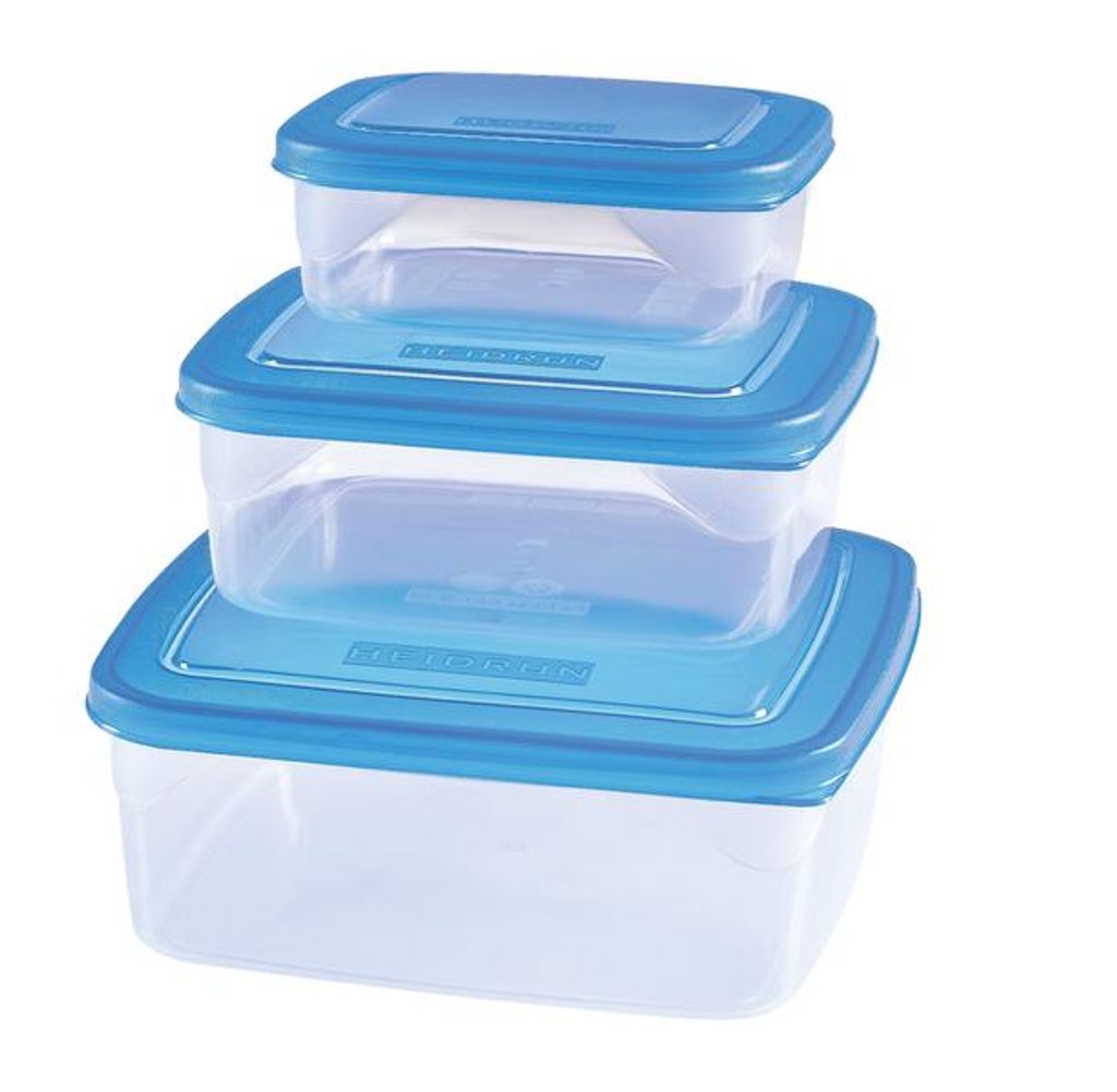 Sada 3 ks čtvercových plastových dóz, v různých barvách. Malá dóza: rozměr 13,5x13,5 cm, objem 0,6 l, střední dóza: rozměr 16,5x16,5 cm, objem 1 l, velká dóza: rozměr 19,5x19,5 cm , objem 1,8 l.