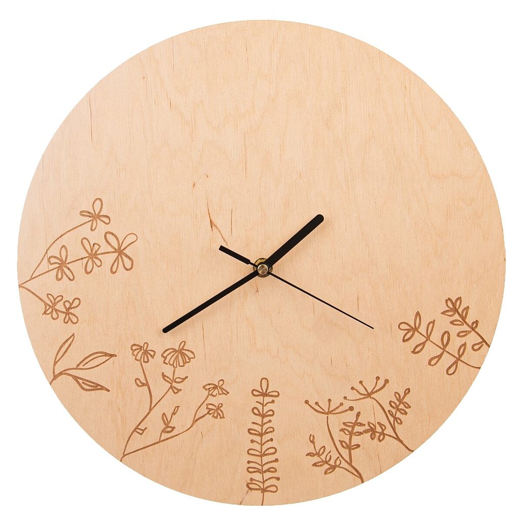 Nástěnné hodiny s dekorem. Materiál: dřevo, plast, kov. Napájení: 1x 1,5V AA baterie (není součástí). Rozměry: pr. 34 cm.