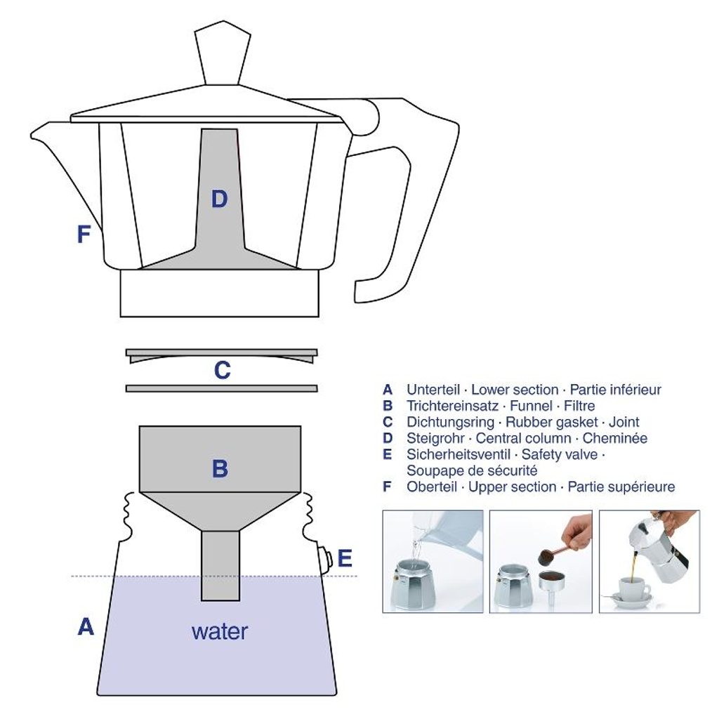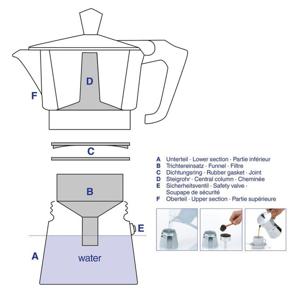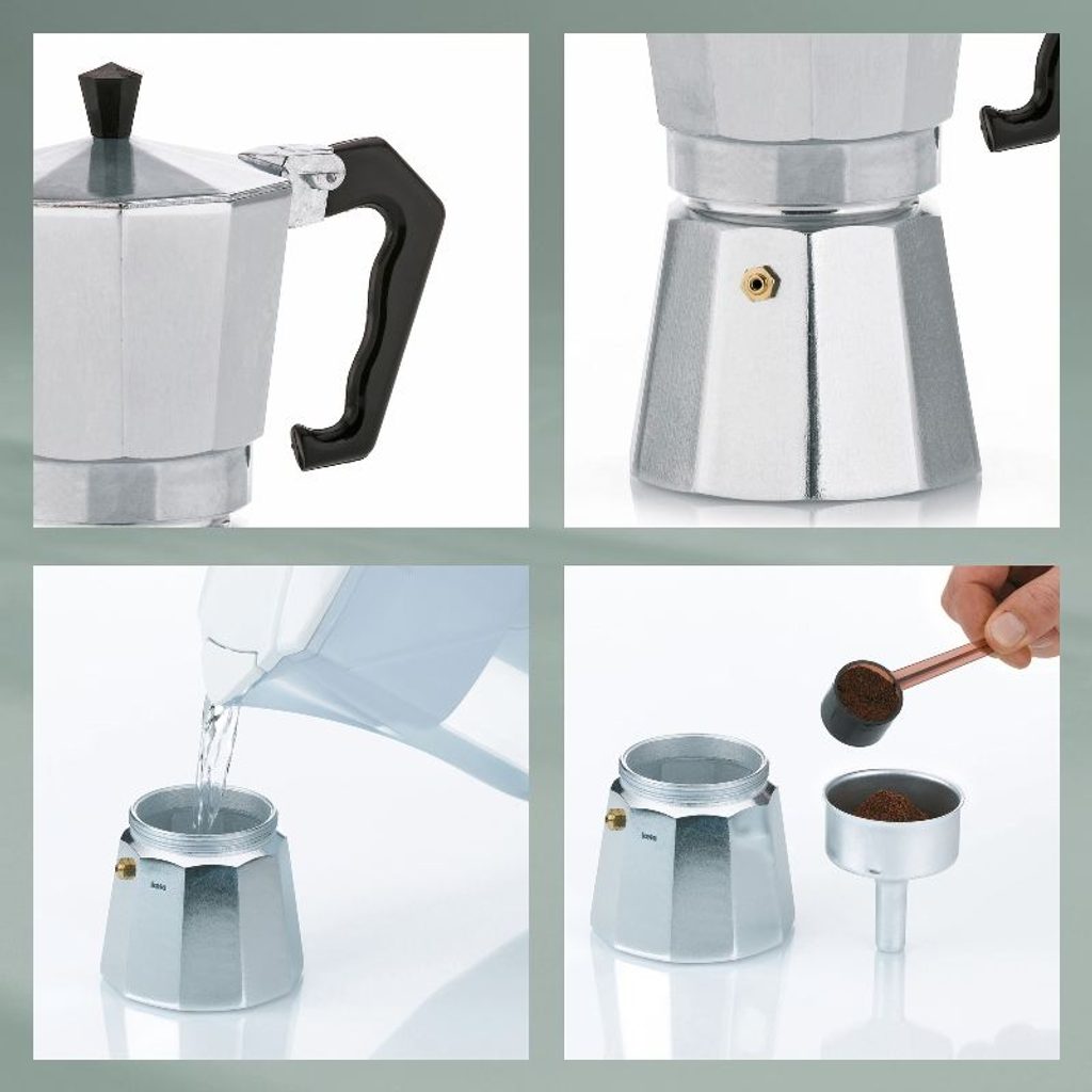 KELA Kávovar ITALIA 6 šálků KL-10591 - Tradiční moka konvice ITALIA vyrobená z potravinářského hliníku vhodná pro přípravu až 6 šálků kávy- klasická příprava espressa originální italskou metodou vysokého tlaku vodní páry- velmi rychlá a jednoduchá obsluha­ plastová rukojeť má nespornou výhodu, že při použití nepálí- vhodná na plynový, elektrický sporák i sklokeramickou desku- ideální využití také na cestách, např. na plynovém vařiči- použité materiály jsou zdravotně nezávadné a neobsahují škodlivé látky- oblíbený designový a také funkční doplněk do kuchyně- vysoce kvalitní zpracování tradiční německé značky KELA- objem: 6 šálků- výška: 17 cm- značka: KELAKonvice na espresso typu moka je přístroj na domácí vaření kávy za použití vysokého tlaku vodní páry. Původ má v Itálii, první vznikla již v roce 1933. Jedná se o, dnes už po celém světě, velmi oblíbený způsob přípravy kávy. Tradičním materiálem pro výrobu vždy byl a je hliník, protože výborně vede teplo, sehnat se dají také nerezové. Obsluhovat moka konvičku je velmi snadné a rychlé, každý se to bez problému naučí během prvního vaření. Do spodní nádobky se nalije voda. Trychtýř (umístěný uprostřed), jehož dno je vybaveno jemným sítkem, se naplní středně mletou kávou.Našroubuje se horní nádoba konvice, která je na její spodní straně také opatřena sítkem, ale ještě jemnějším.Vaří se na mírném ohni. Po pár minutách se ve spodní nádobě začne vytvářet pára, která vytlačí vařící vodu přes trychtýř s mletou kávou do horní části konvice, kde se nám již hromadí hotová káva. Tu pak můžeme rovnou servírovat do šálku. Její chuť bude intenzivní, výrazná, s nezapomenutelným aroma..