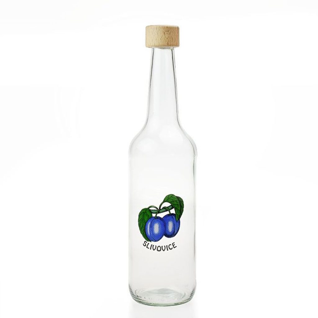 Dárková láhev 500ml s dekorem "švestky" a dřevěným šroubovacím uzávěrem.