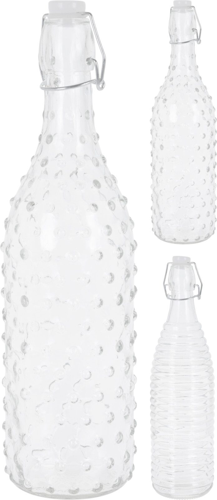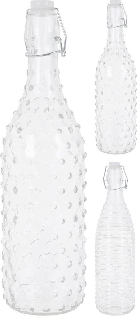 ?Skleněná láhev s praktickým uzávěrem pro uchování čerstvosti nápojů. Skvělý doplněk vašeho stolu. Objem: 1 l.