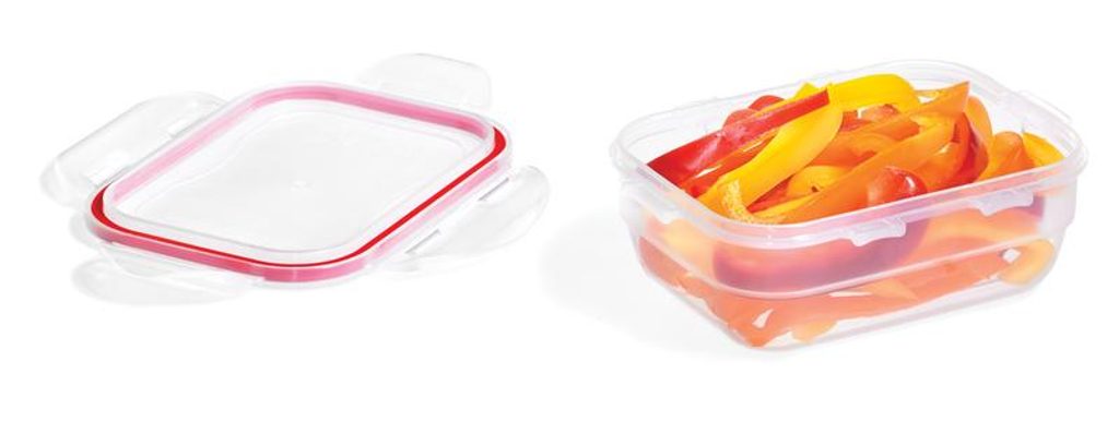 Dózy Lock & Lock "Easy Match" obdélníkové jsou bezpečné a funkční nádoby vyrobené z kvalitního plastu, který je trvanlivý a odolává vysokým teplotám. Tyto dózy jsou 100% vzduchotěsné a tím zajišťují dlouhodobou čerstvost uchovávaných potravin a jsou vynikající také z hlediska uchování vůně (aroma). Čtyři pohyblivé "klipy" zajišťující víko jsou odolné proti opotřebení. Nádoby mají speciálně upravené vnější dno tak, aby se mohly bezpečně stavět na sebe a neklouzaly. Dózy Lock & Lock lze použít v chladničce, v mikrovlnce, v mrazáku i v myčce na nádobí. Dózy Lock & Lock prošly přísnými hygienickými zkouškami a odpovídají nejpřísnějším předpisům. Objem 370 ml. Barva čirá, červená.