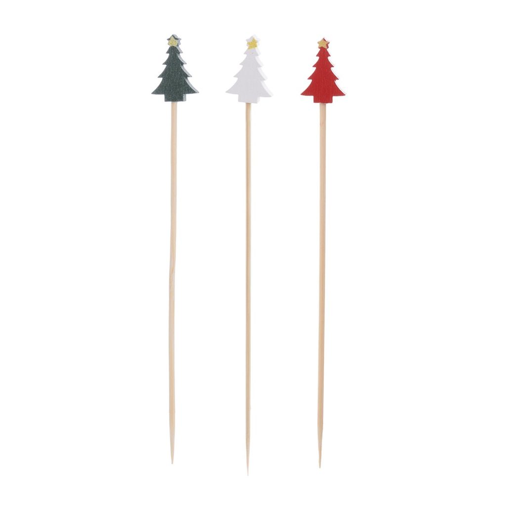 Bambusová napichovátka s barevnou ozdobou ve tvaru STROMEČKU využijete při servírování drobného slaného nebo sladkého pohoštění při různých příležitostech, oslavách, na zimní párty, na vánoční setkání... Ozdobí jednohubky, muffiny, dortíky, olivy, kousky sýra... Sada 20 ks. Materiál: bambus, javorové dřevo s barevným nástřikem (ozdoba). Rozměry: d. 13 cm.