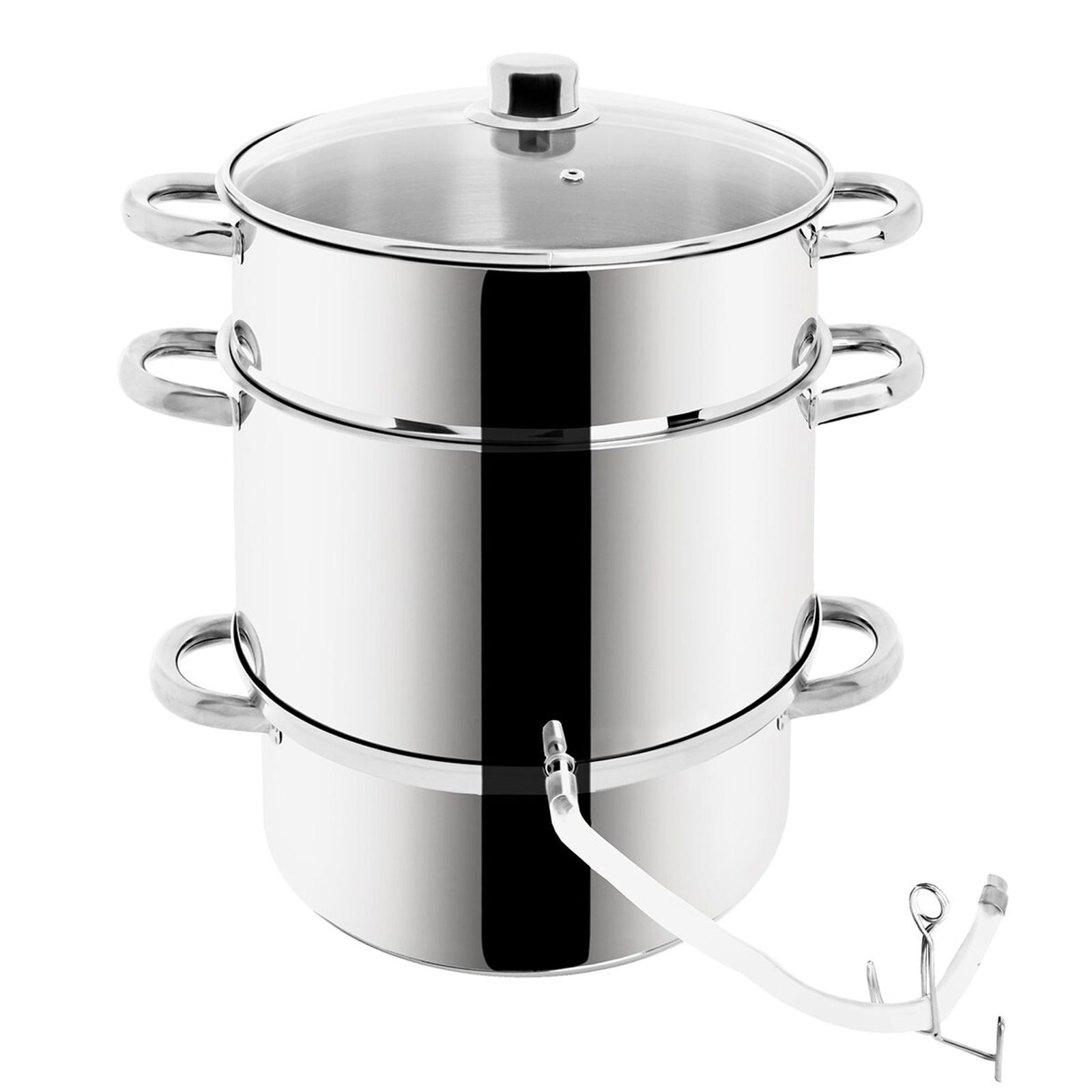 Hrnec na odšťavňování, pro přípravu sirupů i džemů. Varná nádoba se sendvičovým dnem, sběrný hrnec s vypouštěcí hadičkou, perforovaný hrnec k propařování ovoce, skleněná poklice s otvorem pro únik páry. Materiál: kvalitní nerezová ocel. Rozměry: pr. nádob 26 cm, v. celé sestavy 39 cm, objem 8 l. Náhradní hadička v naší nabídce 180623.