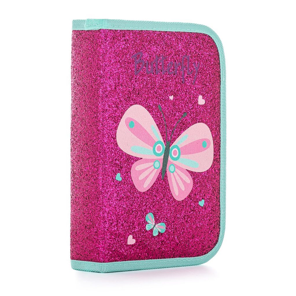 Jednopatrový školní penál s flitrovým efektem se 2 chlopněmi, prázdný obsahuje 25 gumových poutek pro uchycení psacích potřeb. Na vnitřních chlopních jsou průhledné fólie pro rozvrh hodin.