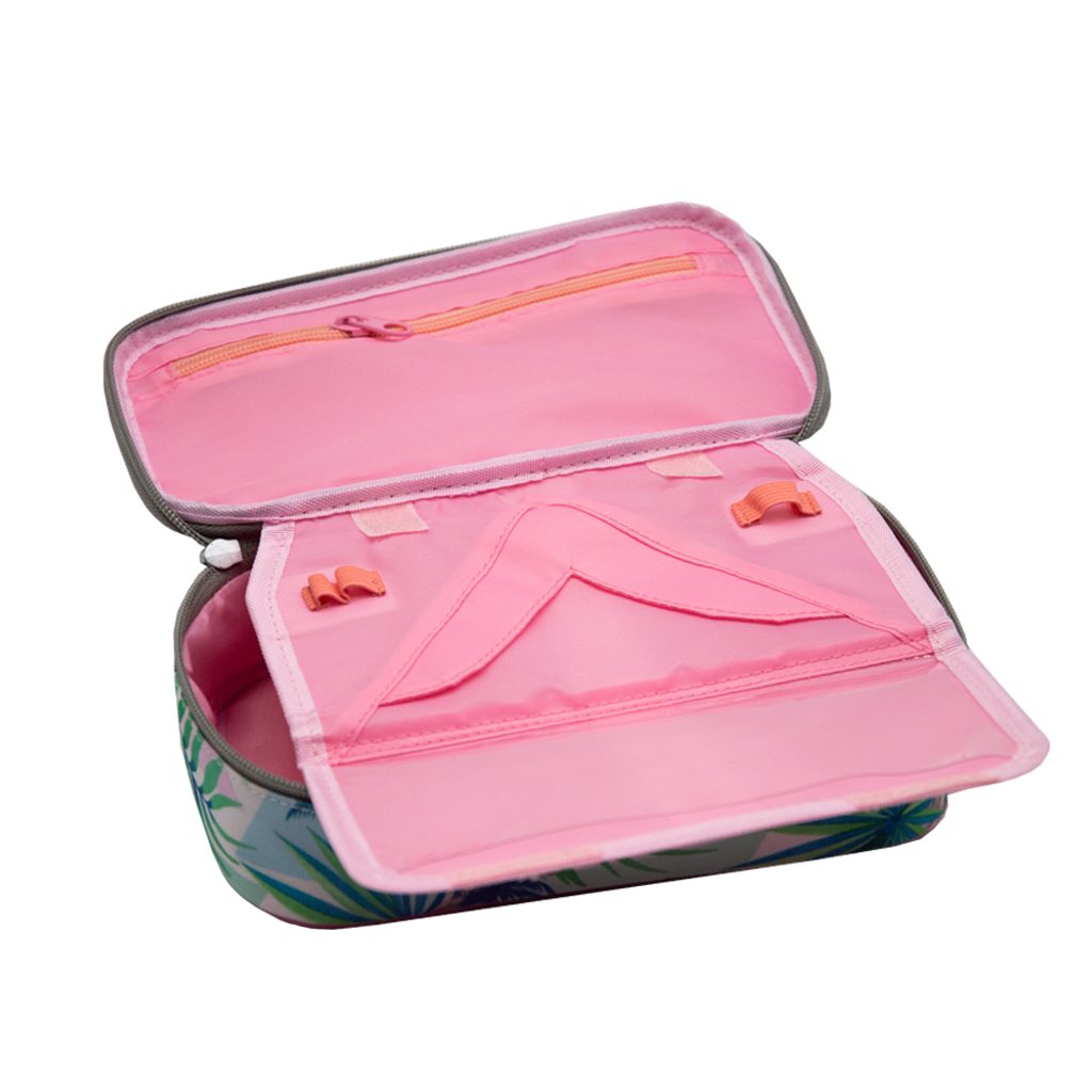 Školní pouzdro je opatřeno pevnými zipy, uzavíratelnou kapsičkou na zip, přihrádkou na pravítko a klopou s šesti poutky na psací potřeby.