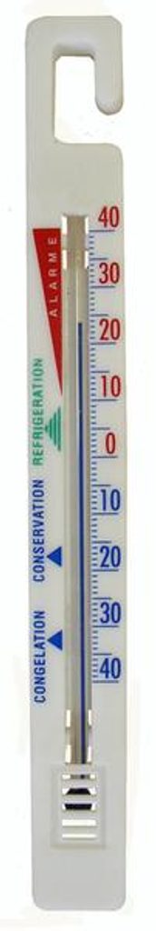 Teploměr do chladničky je základní pomůcka ke kontrole teploty v lednici. Teploměr je mechanický a má stupnici od - 40 do + 40 °C. Teploměr je vyroben umělé hmoty. Teploměr lze připevnit na háček. Rozměry - 15,4 x 1,7 x 0,5 cm.