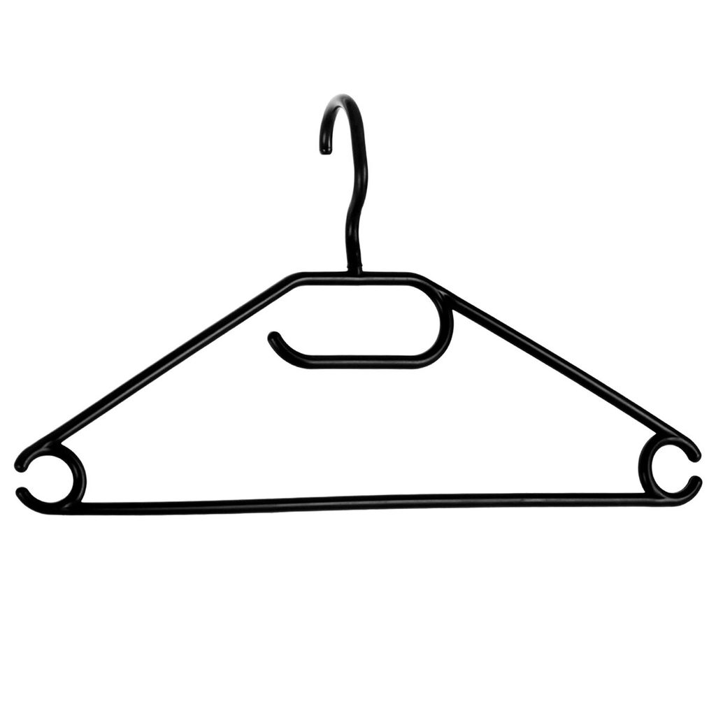 Ramínko s otočným háčkem pro zavěšení. Možnost zavěšení kalhot na spodní tyčce, sukní na postranní háčky, zavěšení šátku či kravaty na středovém háčku. Materiál: plast. Barva černá. Sada 5 ks. Rozměry: 42x1x23 cm.