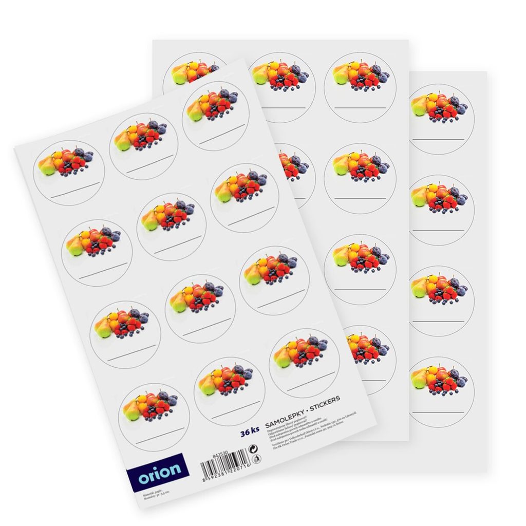 Samolepky na zavařovací sklenice označí i ozdobí váš domácí produkt. Sada 36 ks, ovoce. Rozměry: pr. 3,5 cm.