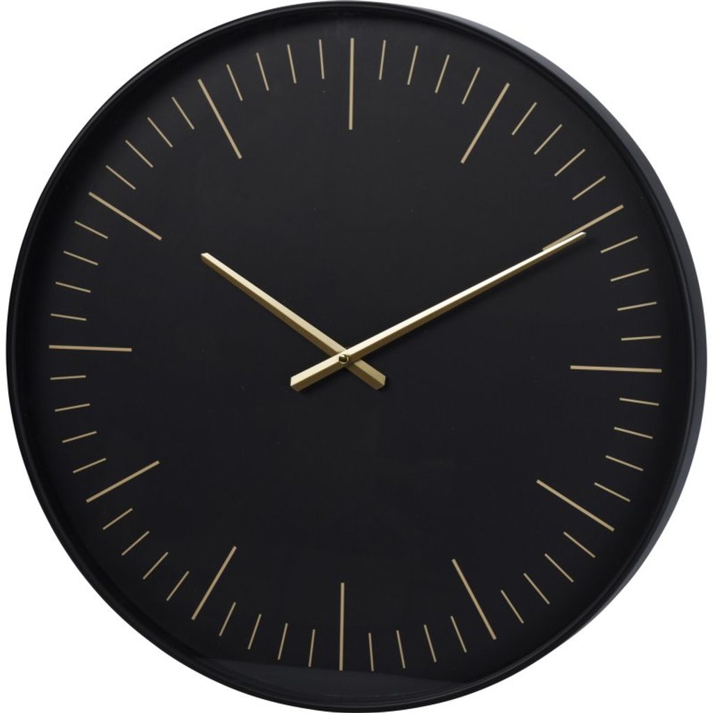 Elegantní nástěnné hodiny v moderním designu s černým ciferníkem a zlatými liniemi a ručičkami. Skvěle doplní interiér a zároveň jsou praktickým pomocníkem při sledování času.