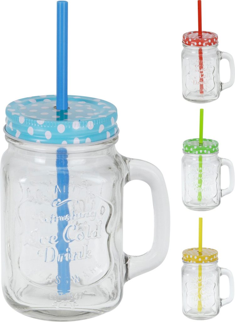 Sklenice s víčkem a brčkem. Ať už na alkoholické nápoje nebo bez alkoholu. Parametry: materiál: sklo víčko - kov brčko - plast objem: 0,4 l průměr: 7,5 cm výška: 13,5 cm