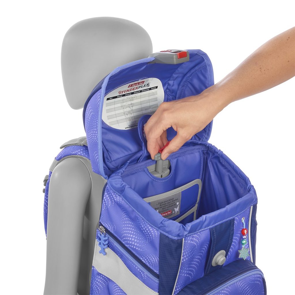 - možnost plynulého výškového nastavení ramenních popruhů pomocí otočného mechanismu uvnitř aktovky, zajišťuje přesné nastavení ramenních popruhů přímo na zádech dítěte
