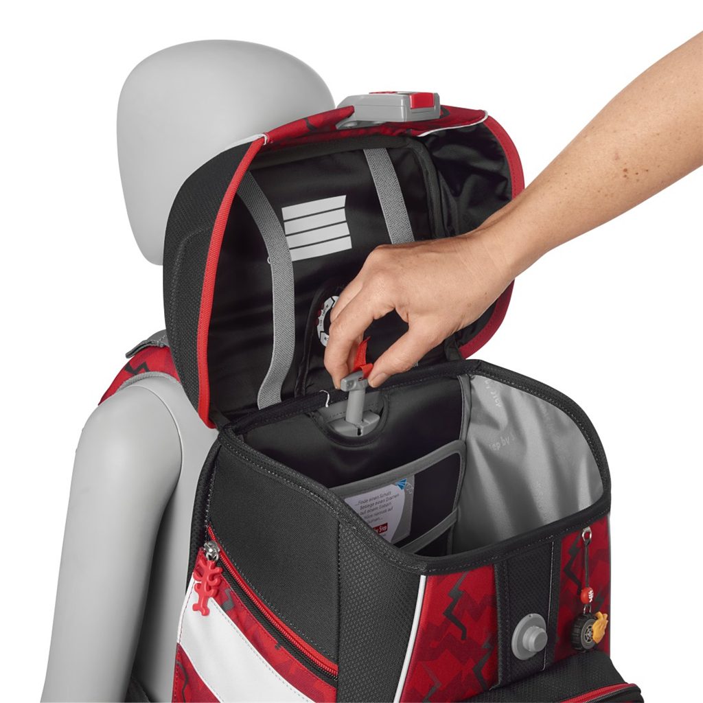 - možnost plynulého výškového nastavení ramenních popruhů pomocí otočného mechanismu uvnitř aktovky, zajišťuje přesné nastavení ramenních popruhů přímo na zádech dítěte