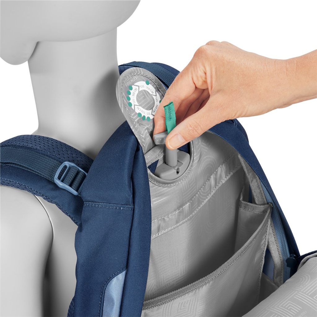 - možnost plynulého výškového nastavení ramenních popruhů pomocí otočného mechanismu uvnitř aktovky zajišťuje