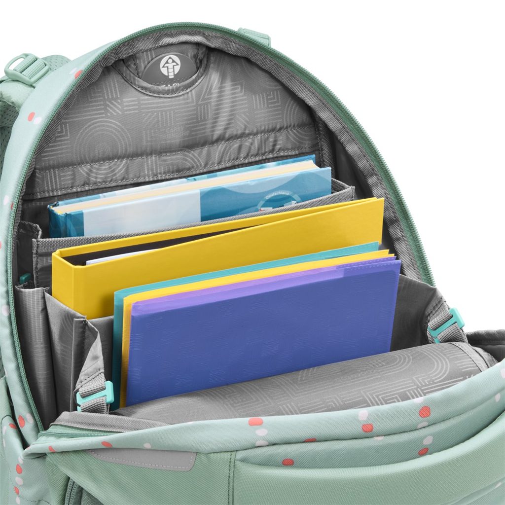 - hlavní kapsa s přihrádkou na knihy a odnímatelnou přepážkou, velká kapsa, kapsa s organizérem a dvě malé přední kapsy např. pro svačinovou krabičku a drobné osobní věci