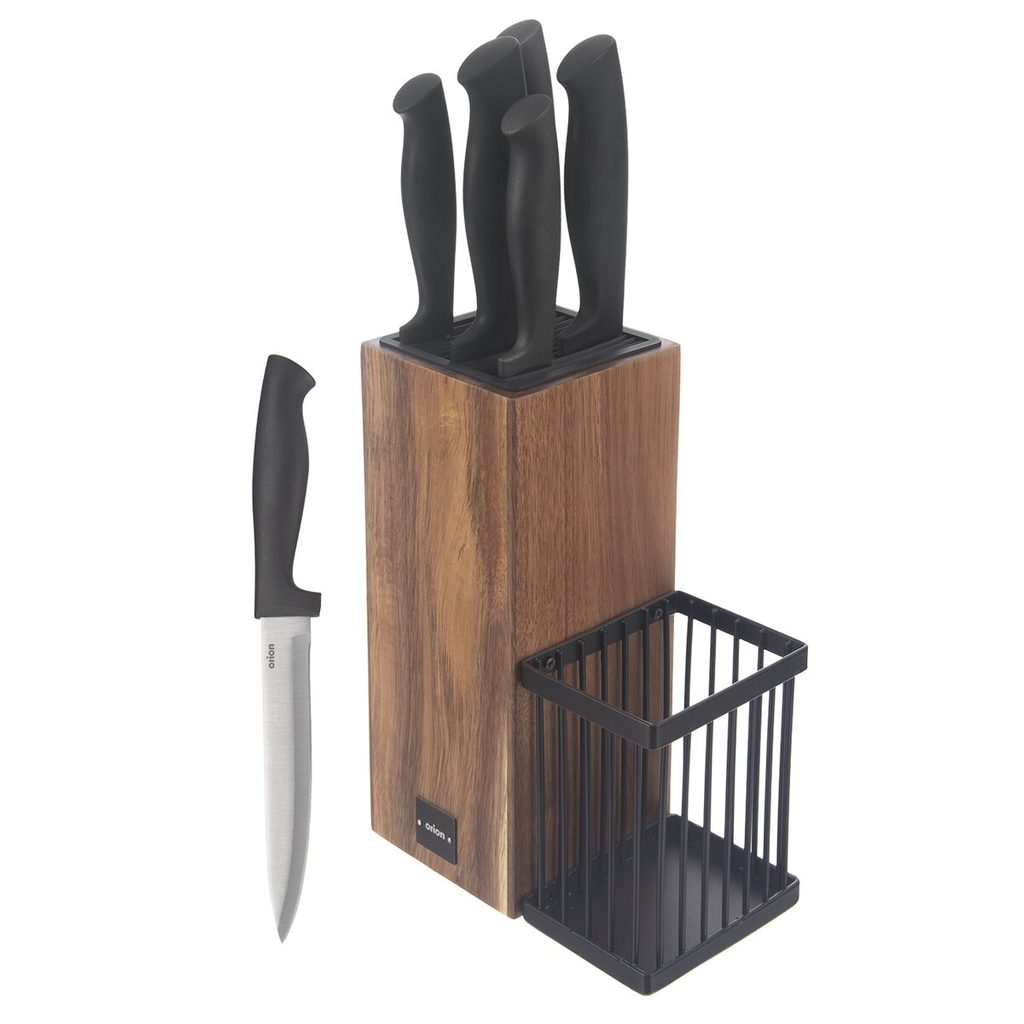 Stojan na nože a kuchyňské náčiní je velmi elegantní a má nadčasový design. Je doplněn 5 noži různé velikosti, které umístíte do gumového vkladu v dřevěné části stojanu. Další kuchyňské náčiní (nůžky, brousek, vařečku...) je možné uložit do kovového postranního košíku. Vše máte po ruce a nože se netupí nikde v zásuvkách. Vypadá velmi stylově, uplatní se jak v moderní, tak klasické kuchyni. Snadná údržba. Materiál: akáciové dřevo, plast, kov – košík, nerezová ocel – čepel nožů, plast – rukojeť nožů. Rozměry: stojan 16x9x22,5 cm, nože (čepel/celková délka) 7,5/18 cm, 12,5/23 cm, 14,5/27 cm, 20/32 cm, se zubatým ostřím 17,5/30 cm. Stojan není vhodný do myčky, nože jsou vhodné do myčky. Po umytí v myčce dobře vysušte. Častým používáním myčky dochází k postupnému tupení ostří.