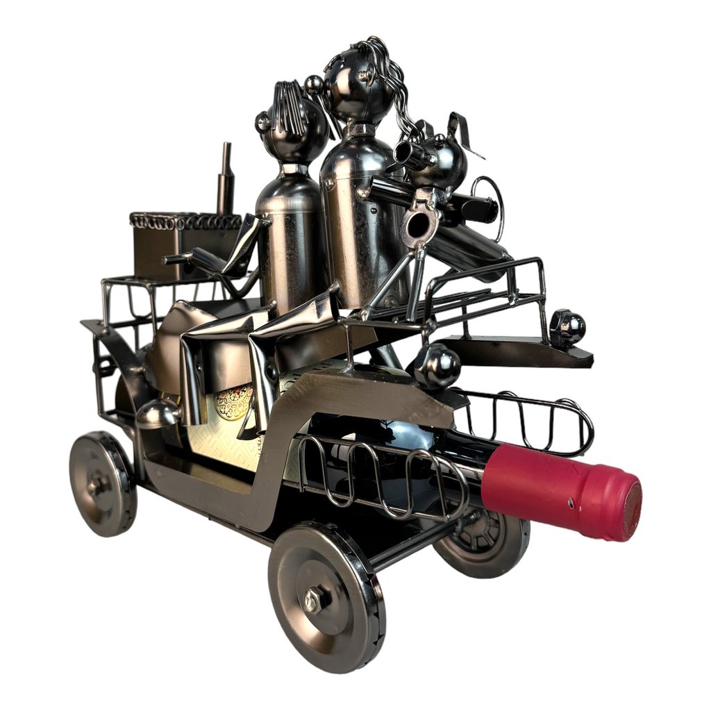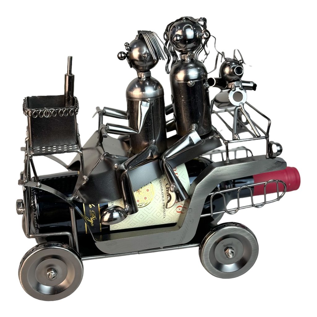 Dárkový stojan na víno kovový v provedení páru v autě s pejkem.
