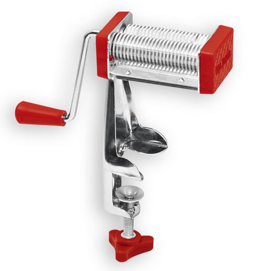 Mechanický kovový strojek pro krájení stejnoměrných vlasových nudlí do polévky. Připravené vyválené těsto nakrájené na 6 cm široké pruhy stačí vložit mezi ozubené části a otáčením klikou dosáhnete stejnoměrných polévkových nudlí, tenkých cca 1 mm. Délku můžete zvolit dle libosti. Jsou vhodné k sušení, ale i k okamžitému vaření ve vývaru. Strojek se upíná k pracovní desce nebo stolu šroubem, po použití jej stačí vyčistit kuchyňským ubrouskem nebo štětcem a uložit.