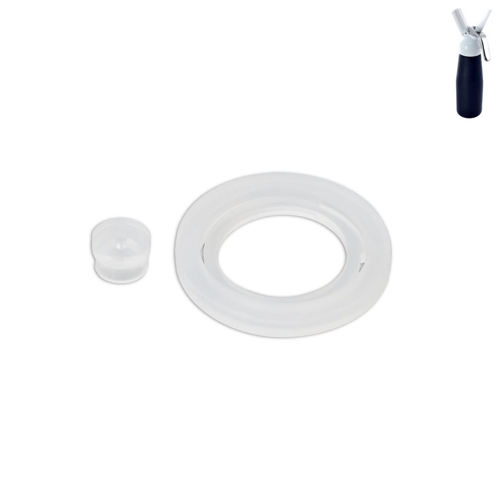 Silikonová těsnění k šlehačkové lahvi. Těsnění pod hlavu lahve - pr. 4,7 cm, těsnění pod bombičku - pr. 1,2 cm. Náhradní díl je vhodný k láhvi 130624.